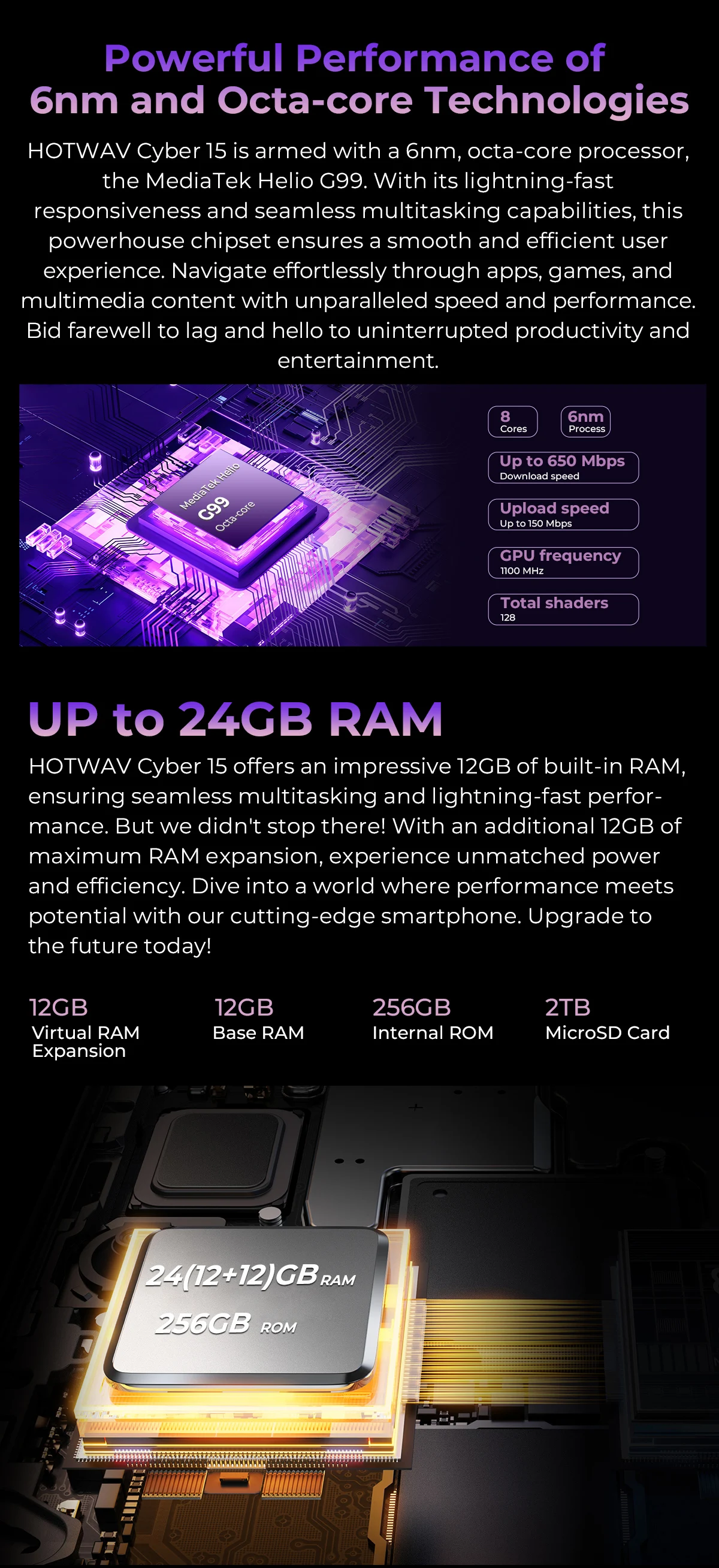 HOTWAV Cyber 15 features an expansive 256GB of built-in storage, perfect for storing your vast collection of high-resolution videos, photos, and important files. With the flexibility to expand storage using a microSD card, you can boost your content library to incredible levels, allowing you to add up to an impressive 2TB of extra storage capacity.